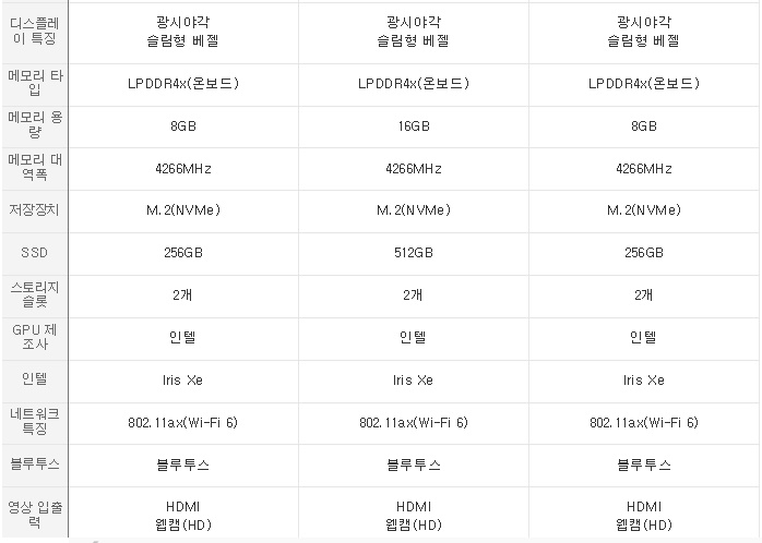35.5cm(14인치) / 인텔 / 코어i5-11세대 / 타이거레이크 / i5-1135G7 / 쿼드코어 / 운영체제(OS): 윈도우10 / 1920x1200(WUXGA) / DCI-P3: 99% / IPS / 광시야각 / 슬림형 베젤 / LPDDR4x(온보드) / 16GB / M.2(NVMe) / 256GB / 내장그래픽 / 802.11ax(Wi-Fi 6) / HDMI / 웹캠(HD) / 썬더볼트4: 2개 / USB 4.0 / USB 3.1 / UFS / MicroSD카드 / 지문인식(전원버튼) / USB-PD / ㅗ형 방향키 / 배터리: 72Wh / 충전단자: 타입C / 두께: 16.8mm / 무게: 999g / 일반유통상품 / 용도: 사무/인강용 , 휴대용 / 색상: 화이트
